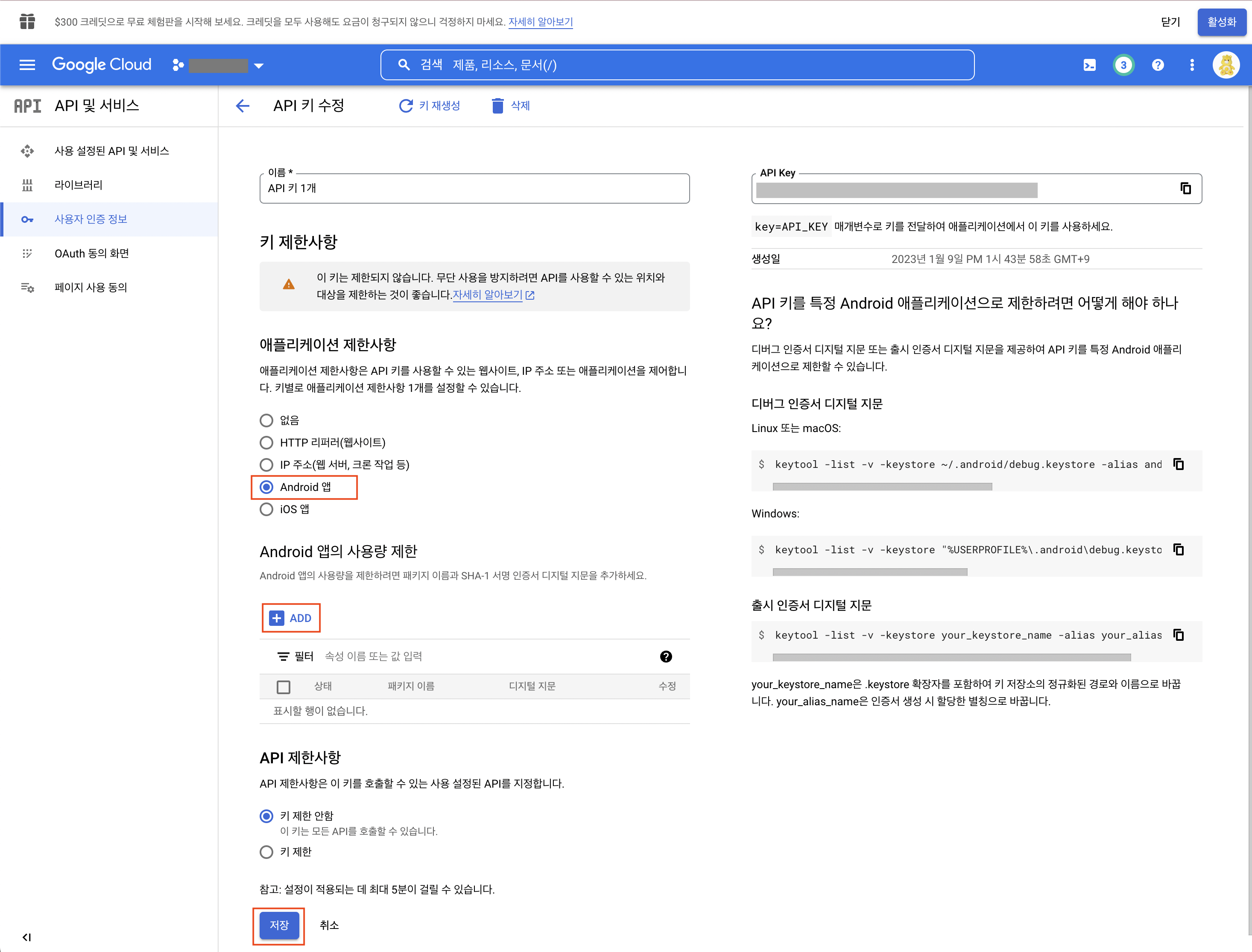API 키에 대한 설정을 해주고 저장 버튼을 클릭합니다.