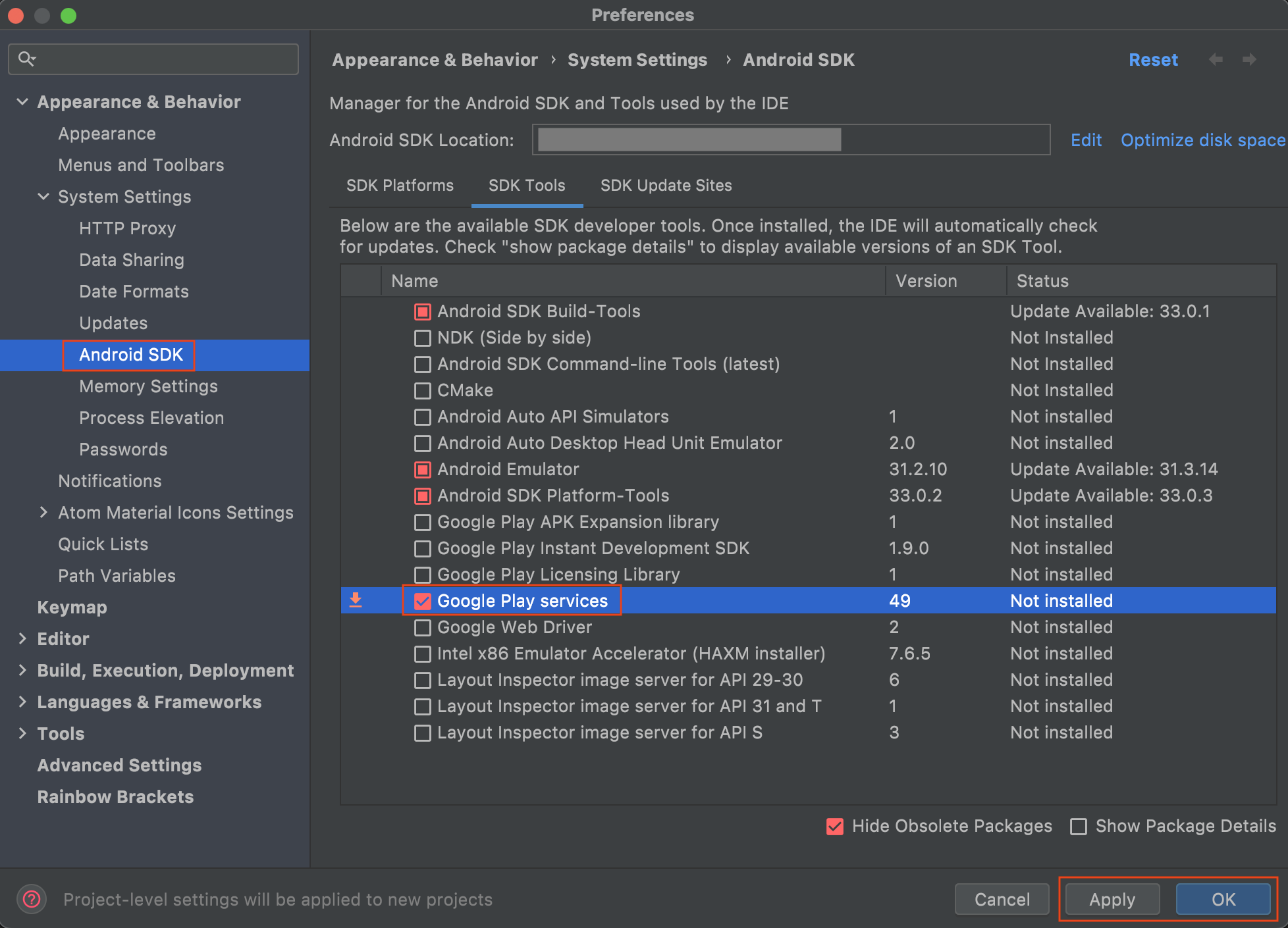 상단 메뉴바의 Tools > SDK Manager 로 들어와서 SDK Tools 탭에서 Google Play services 체크 후 Apply, OK 버튼을 클릭하여 설치 후 적용해줍니다.